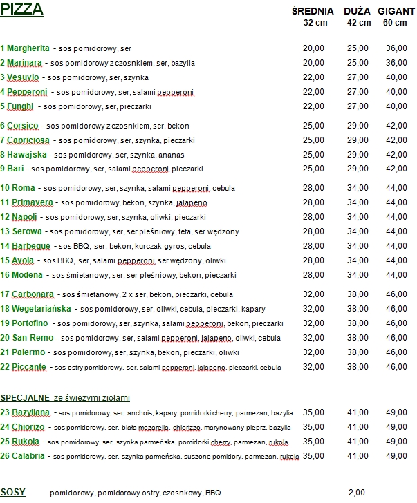 Pizza w Bazylianie jest zawsze na cienkim, dobrze wypieczonym cieście. W trzech rozmiarach, średnia 32 cm, duża 42 cm oraz gigant ma aż 60cm! (zamówcie z dostawą do domu i zobaczcie minę dziecka, kiedy odbiera pizzę, która ledwo mieści się w drzwiach :)