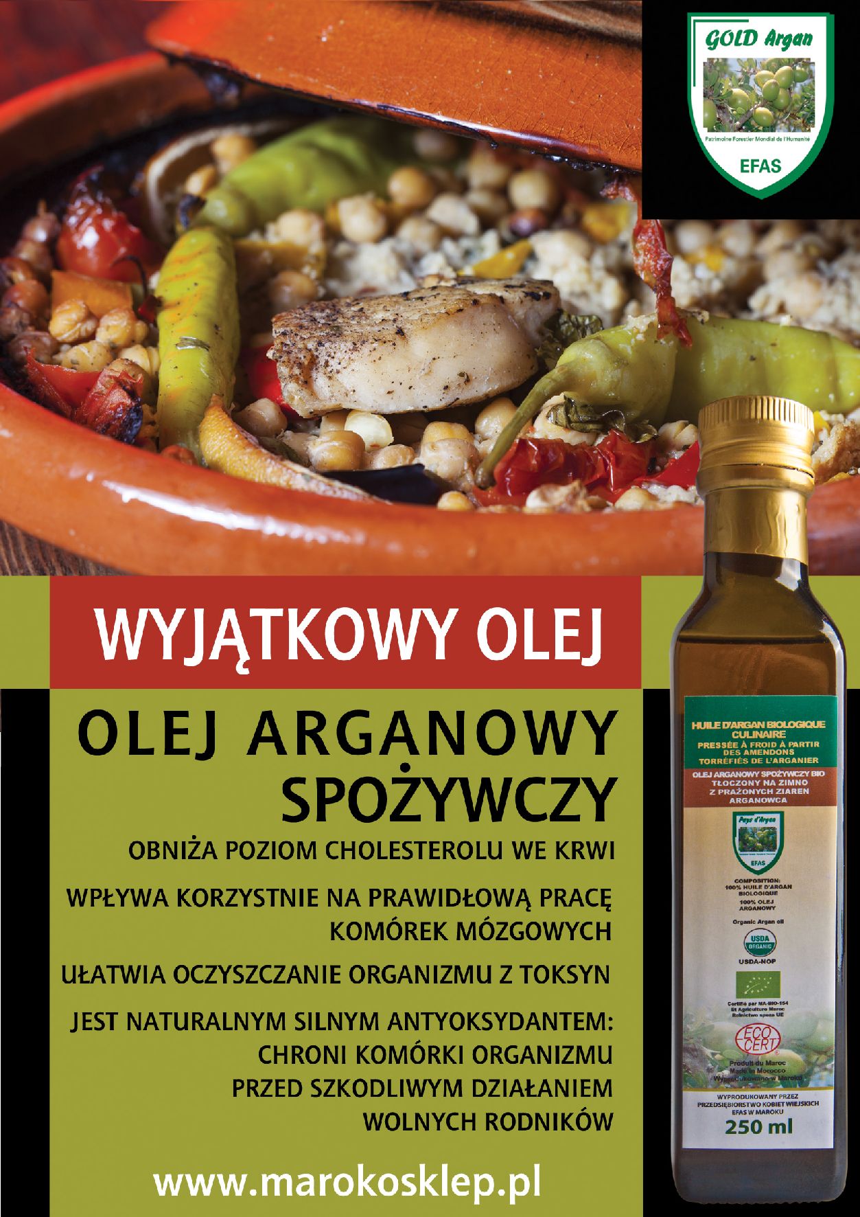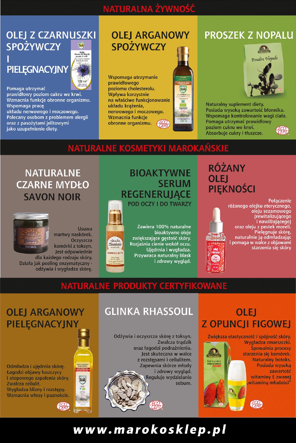 Sklep oferuje także kosmetyki z Maroka na bazie oleju arganowego, jak również czarne mydło naturalne i wiele innych wspaniałych w swej prostocie dóbr z tego pięknego i słonecznego kraju.