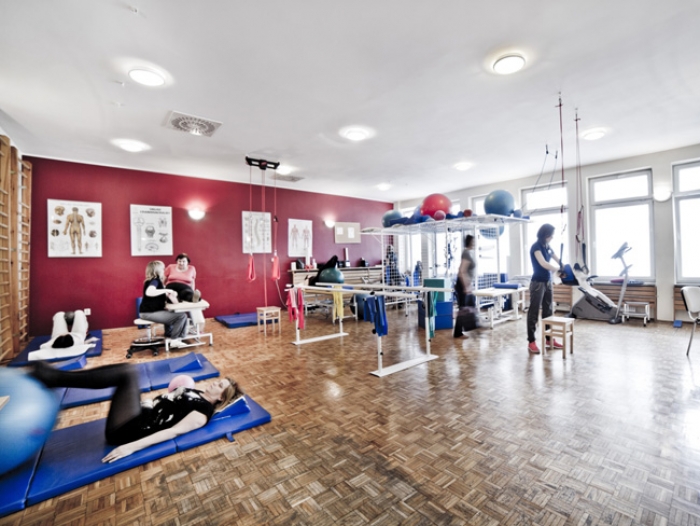 Obok zaplecza fizykoterapeutycznego placówka dysponuje dużą, dobrze wyposażoną salą rehabilitacyjną.