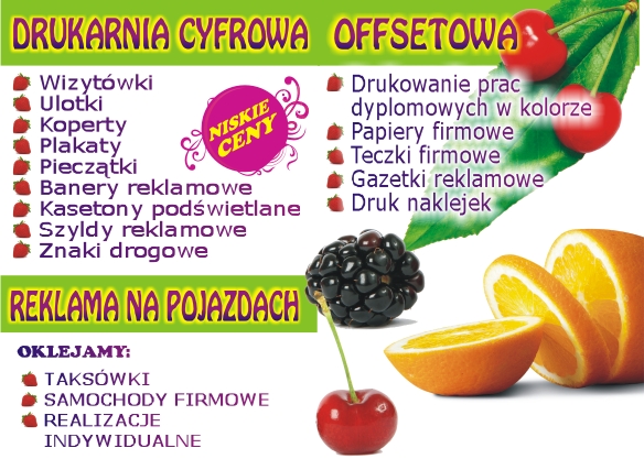 Wizytówki, pieczątki, papier firmowy, teczki firmowe, foldery, ulotki, plakaty, wydruki wielkoformatowe. Tanie wydruki cyfrowe i offsetowe, szyldy reklamowe, banery reklamowe, reklama świetlna, oklejanie samochodów, gadżety reklamowe.